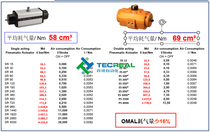 其次我们选取两者的单动型号,OMAL气动执行器平均耗气量/ Nm为58 cm³,埃尔蒂克平均耗气量/ Nm为 69 cm³,OMAL品牌在耗气量上少16%左右。
