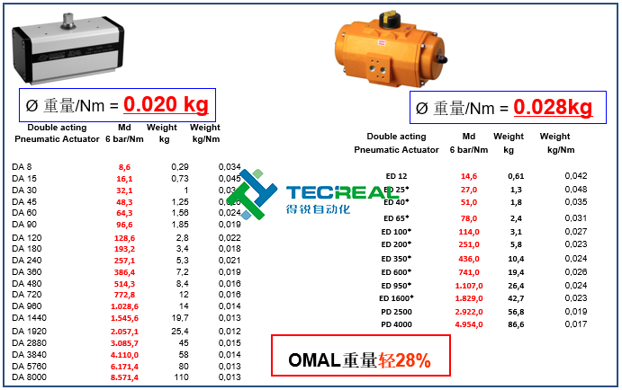 我们同样先从两者的双动型号开始测试,OMAL气动执行器 Ø 重量/Nm = 0.020 kg,而埃尔蒂克Ø 重量/Nm = 0.028kg,OMAL比它轻28%。