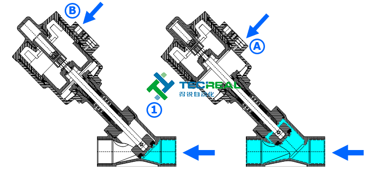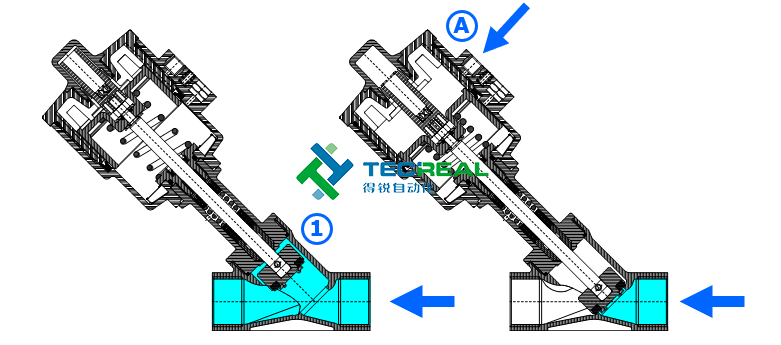向执行器供应空气(从端口(A))弹簧被压缩,阀塞关闭阀门通道。