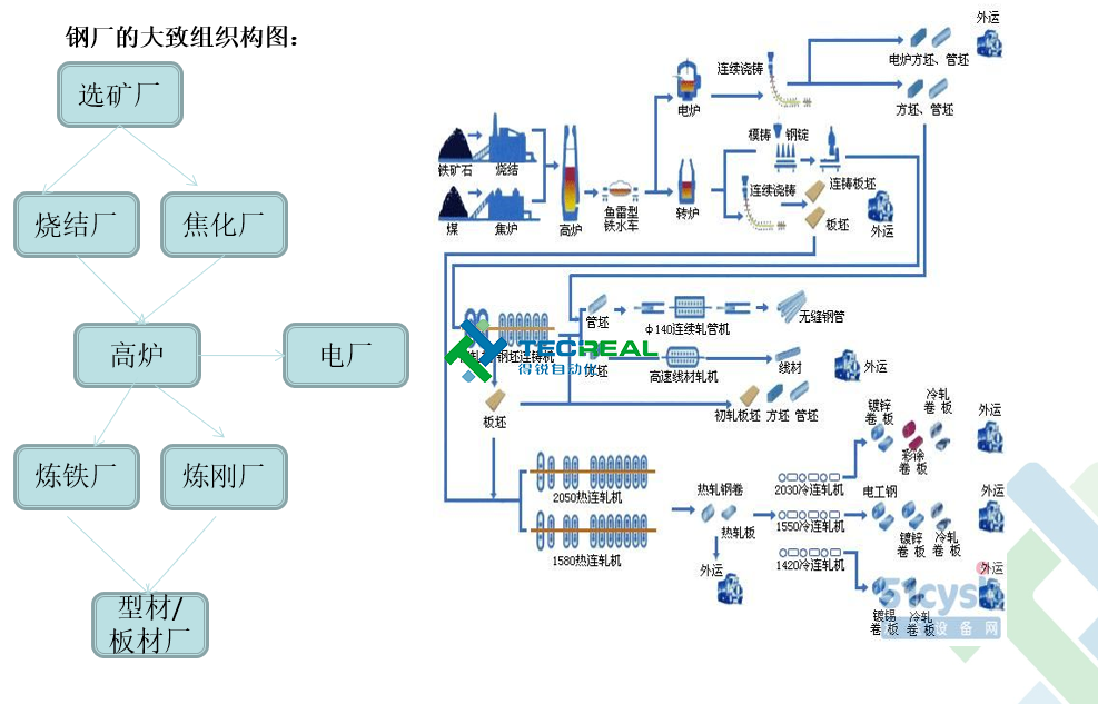 烧结厂:为高炉冶炼提供合格铁矿石原料加工,即将各种粉状含铁原料,配入适量的燃料和溶剂,加入适量的水,经混合和造球后在烧结设备上使物料发生一系列物理化学变化,将矿粉颗粒黏结成块的过程。